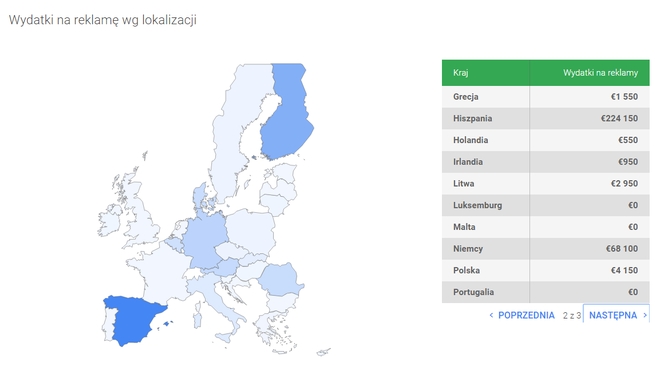 Na czele krajów, w których na reklamy przedwyborcze wydano najwięcej (ponad 224 tys. euro) znalazła się Hiszpania, która wyprzedziła Finlandię (z górą 142 tys. euro) i Niemcy (ponad 68 tys. euro).