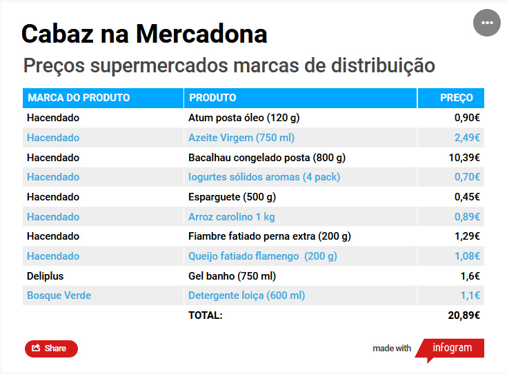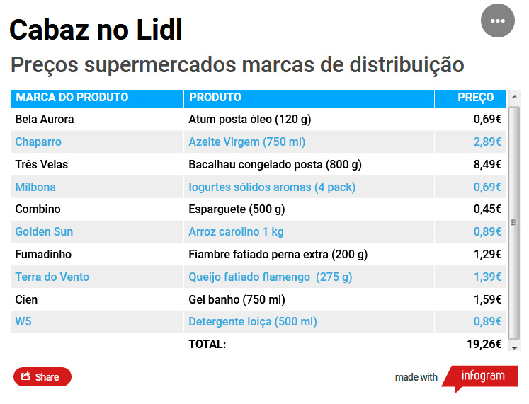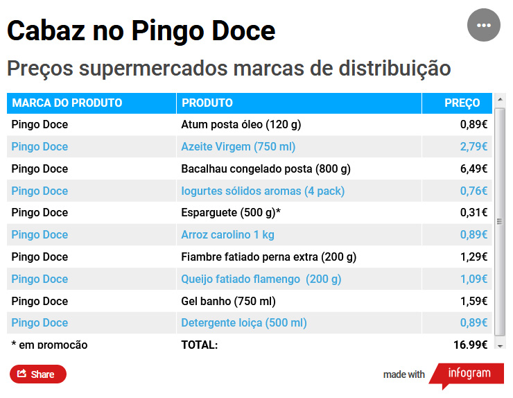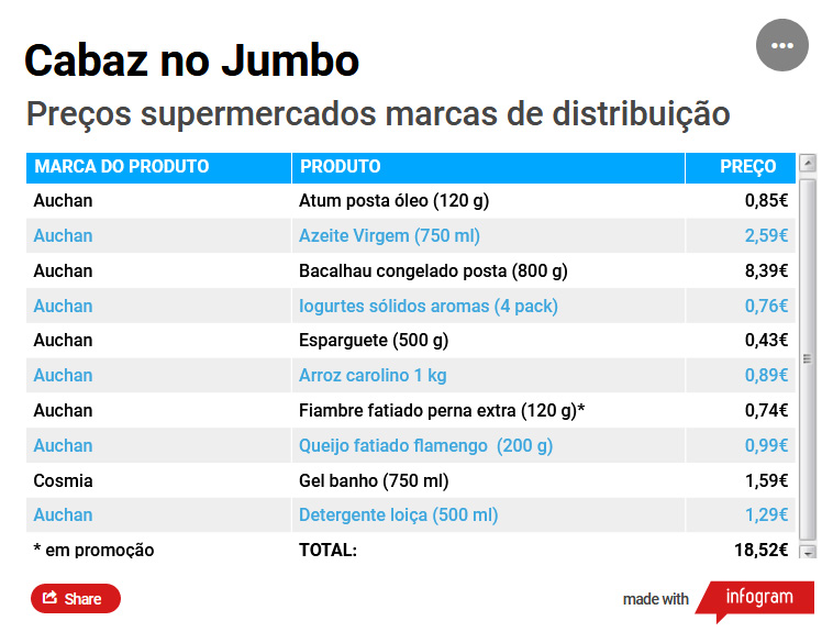 Para a criação do cabaz foram escolhidos apenas produtos de marca da distribuição, das categorias alimentar (atum, azeite, bacalhau, iogurtes, esparguete, arroz, fiambre, queijo), de limpeza doméstica (detergente loiça) e higiene pessoal (gel de duche). Em alguns casos, não havendo produto com a mesma gramagem, optou-se pela mais próxima disponível (110 g ou 275 g, o que sucedeu no caso dos produtos fatiados). O objetivo era, apesar das naturais diferenças entre as marcas próprias, eliminar o mais possível fatores que pudessem enviesar a comparação. Havendo na mesma categoria de produto duas marcas próprias da cadeia – por exemplo, o Continente tem a Continente e a É -, optou-se pelo produto com o preço mais baixo.